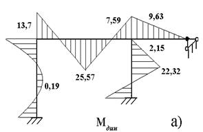 Для построения динамической эпюры изгибающих моментов в характерных сечениях стержней рамы используется следующее суммирование: М дин = М1Х1 + М2Х2 + М3Х3 + М (6.11) В (6.11) M1, M2, M3, - эпюры изгибающих моментов от единичных значений сил инерции I1 , I 2, I3. Эти эпюры представлены на рис. 6.5,a, 6.5,6, 6.5,в. М - эпюра изгибающих моментов от амплитудных значений вибрационной нагрузки, она представлена на рис. 6.9,б, X 1, Х2, Х3 - найденные значения сил инерции. Эпюра династических поперечных сил Q дин строится из эпюры Мдин, т. к. Q дин =