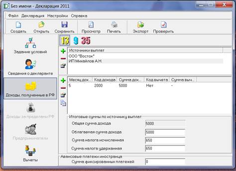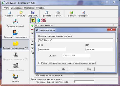 6. Заполнить раздел "Доходы, полученные в РФ" Заполняем реквизиты организации из справки 2-НДФЛ (нажать на + в источниках выплаты) Здесь ОКАТО по месту работы (может быть не таким, как в предыдущем разделе).