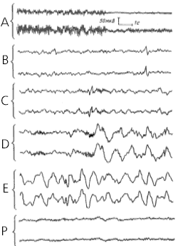 Динамику электрической активности мозга в процессе развития и течения сна у человека изучали многие исследователи. Была предложена классификация стадий сна на основе изменений уровня сознания и формы электроэнцефалограммы. К основным стадиям развития естественного сна у человека относят (рис. 6):