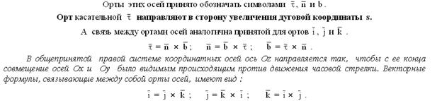 Дуговую координату в задачах кинематики желательно не путать с пройденным точкой путем, который во всех школьных задачах, как правило, обозначался таким же символом s. Дуговая координата может быть положительной и отрицательной, может увеличиваться и уменьшаться. Пройденный путь может только увеличиваться и не может быть отрицательной величиной. При этом способе задания движения для определения характеристик движения точки вводится особая система взаимно перпендикулярных осей, движущихся вместе с точкой и меняющих свое положение в пространстве. Оси принято называть естественными осями координат. Совокупность взаимно-перпендикулярных плоскостей, определяемых этими осями, называют подвижным трехгранником. Одна из осей всегда направляется по касательной к траектории движущейся точки; другая ось - к центру кривизны траектории точки (эту ось называют нормалью); третью ось - бинормаль направляют так же, как ось z направлена по отношению к осям x и y. Касательная, нормаль и бинормаль определяют положение плоскостей подвижного трехгранника. Нормальная плоскость перпендикулярна касательной к траектории точки и проходит через центр кривизны траектории; соприкасающаяся плоскость проходит через касательную к траектории точки и центр кривизны траектории. Третья плоскость называется спрямляющей. О том, что задается при естественном способе задания движения точки, напоминает плакат 4к. Выведем теперь формулы для определения векторов скорости и ускорения точки при рассматриваемом способе задания ее движения.