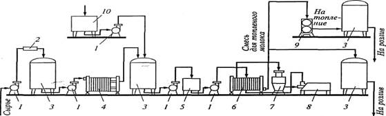 Устройство и принцип действия линии. Вначале оценивается качество молока и производится его приемка, в процессе которой молоко перекачивается центробежными насосами 1 из автомолцистерн. Для определения количества молока на заводах используют устройства для измерения массы—весы и объема—расходомеры-счетчики 2. Масса принимаемого молока может устанавливаться также за счет использования емкостей 3 с тензометрическим устройством или путем использования тарированных емкостей. Принятое молоко проходит первичную обработку, в процессе которой оно сначала очищается от механических примесей на фильтрах или сепараторах-молокоочистите-лях, а затем оно охлаждается до 4...6 °С на пластинчатых охладителях 4 и насосами 1 по трубам через уравнительный бачок 5 направляется в емкости хранения 3. Молоко с температурой не выше 10 °С допускается принимать без охлаждения. Охлажденное молоко хранится в емкостях 3 и нормализуется. С помощью нормализации доводят до требований стандарта содержание в молоке жира или сухих веществ. В зависимости от жирности исходного сырья и вида вырабатываемого молока для нормализации по содержанию жира используют обезжиренное молоко или сливки, по содержанию сухих веществ — сухое обезжиренное молоко. На практике, как правило, приходится уменьшать жирность исходного молока. Нормализацию молока проводят двумя способами: в потоке или путем смешивания. Для нормализации в потоке используют сепараторы-нормализаторы, в которых непрерывная нормализация молока совмещается с очисткой его от механических примесей. Перед поступлением в сепаратор-нормализатор молоко предварительно нагревается до 40...45°С в секции рекуперации пластинчатой пастеризационно-охладительной установки 6. На предприятиях небольшой мощности молоко обычно нормализуют смешиванием в резервуарах 3. Для этого к определенному количеству цельного молока при тщательном перемешивании добавляют нужное количество обезжиренного молока или сливок, рассчитанное по материальному балансу. При производстве белкового молока используют сухое молоко, которое предварительно растворяют в емкости 10. Для предотвращения отстоя жира и образования в упаковках сливочной пробки при производстве молока топленого, восстановленного и с повышенной массовой долей жира (3,5...6,0 %) нормализованное молоко подогревают до 40...45 °С и очищают на центробежных сепараторах-молокоочистителях 7 и обязательно гомогенизируют в гомогенизаторах 8 при температуре 45...63 °С и давлении 12,5... 15 МПа. Затем молоко пастеризуют при 76 °С (±2 °С) с выдержкой 15...20 с и охлаждают до 4...6 °С с использованием пластинчатых пастеризационно - охладительных установок 6. Эффективность пастеризации в таких установках достигает 99,98 %. При выработке топленого молока нагрев осуществляют при температуре 95...99 °С в трубчатых или пластинчатых пастеризаторах 9. Выдержку при данной температуре или процесс топления молока проводят в закрытых емкостях 3 в течение 3...4 ч. После топления молоко охлаждают в пластинчатых пастеризационно - охладительных установках до температуры 4...6 °С. Затем молоко при температуре 4...6°С поступает в промежуточную емкость 3, из которой направляется на фасование. Перед фасованием выработанный продукт проверяют на соответствие требованиям стандарта. Пастеризованное молоко выпускают в стек