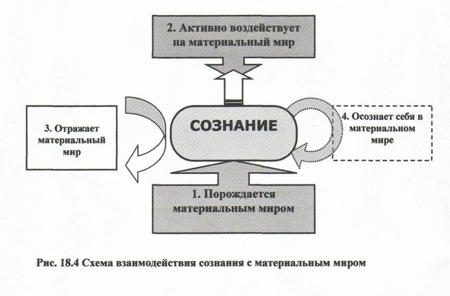 С точки зрения материалистической науки, между сознанием человека и окружающим материальным миром существуют четыре вида взаимодействий (Рис. 18.4). Первый и второй тип взаимодействия диалектически связаны: первично сознание рождается из материального мира и определяется им, но затем, по мере своего созревания, оно начинает активно влиять на этот мир, преобразуя его по собственному плану. Третий и четвертые типы взаимодействия сами по себе не материальны, а относятся к информационному типу. При этом третий тип взаимодействия только кажется пассивным. На самом деле это активное отражение, включающее в себя элементы осмысления, оценки и преобразования. Самый сложный и позже всех развивающийся – четвертый тип взаимодействия, который знаменует собой высшую стадию развития сознания – самосознание.