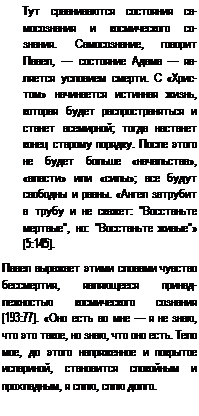«Ибо думаю, что нынешние вре- Павел говорит о славе и радости менные страдания ничего не ЖИзни в космическом сознании, стоят в сравнении с тою славою, жизни, которая начинает загораться которая откроется в нас. над миром; он сравнивает ее с со- стоянием самосознания, до сих пор бывшим универсальным. «Будущее славы, — говорит Уитмен, — непрекращающееся и возрастающее». «Радость, вечная радость», — говорит Элугканам. «Радость с началом, но без конца», — говорит Е. С. «Если вы раз, — говорит Серафита (т. е. Бальзак), — почувствовали восторг опьянения (просветления), то вы обладаете всем» [7:182]. Сравните также следующие выдержки из Бёме, в которых он, подобно Павлу, противопоставляет жизнь в