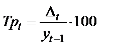 где Величина темпа роста больше 100 показывает увеличение уровня текущего периода по сравнению с предыдущим (базисным). Величина темпа роста, равная 100, показывает, что уровень текущего периода по сравнению с предыдущем (базисным) не изменился. Темп роста всегда имеет положительный знак. Цепные темпы роста характеризуют интенсивность изменения уровней ряда. Темп прироста – это отношение абсолютного прироста к базе сравнения. Этот показатель характеризует относительную скорость изменения уровня ряда в единицу времени: