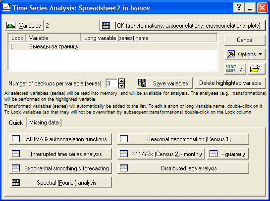 Открывается модуль, в котором реализованы практически все современные методы анализа и прогнозирования, и который будет постоянно использоваться при выполнении курсового проекта (рис. 2.20). С помощью кнопки Variables выбираем необходимую переменную и получаем следующий вид окна (рис. 2.21).