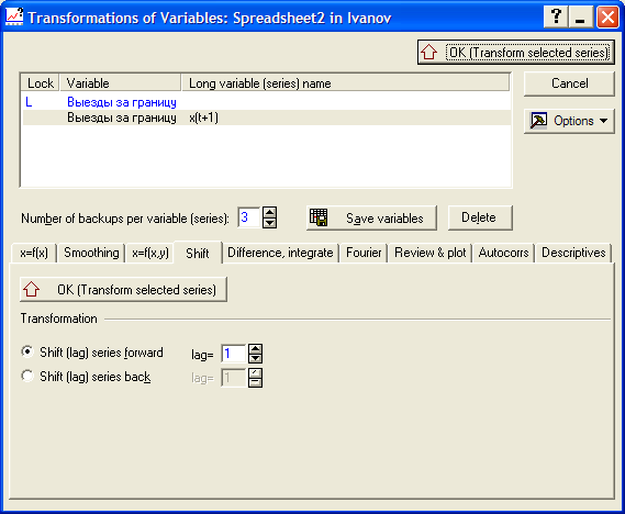 Рассмотрим рабочую область данного модуля: 1. В верхней части панели, в информационном поле записываются имена анализируемых и преобразованных переменных. Рядом с информационным полем расположены стандартные кнопки системы (Cancel, Options). Сверху от информационного поля уже известная нам кнопка Variables для выбора переменных и кнопка ОК (transformations, autocorrelations, crosscorrelations, plots). 2. Нижняя часть панели (под пояснительным текстом) – функциональная. На закладке Quick расположены кнопки, открывающие специальные диалоговые окна анализа, а закладка Missing Data содержит опции обработки пустых ячеек. После выбора переменной для анализа в информационном поле появляются ее имя, а слева значок «L» в графе Lock, который означает, что выбранные переменные являются закрытыми на «ключ» и не могут быть удалены без прерывания анализа. Дальнейшая работа происходит именно с этими переменными, которые можно преобразовывать, анализировать, трансформировать, но нельзя удалять из текущего анализа. В процессе работы динамические ряды подвергаются многократному преобразованию. Однако, не все результаты этих преобразований необходимы в работе. Кнопка Delete highlighted variable позволяет удалять из диалогового окна лишнюю информацию (выделенную переменную). Напротив, некоторые переменные используются для дальнейшего анализа и их необходимо сохранять (кнопка Save variables). Для расчета цепных показателей изменения уровней динамического ряда необходимо иметь две переменные: первая переменная – исходный динамический ряд, состоящий из уровней сравниваемых периодов yt,, а вторая переменная – динамический ряд, состоящий из уровней непосредственно предшествующих периодов yt-1, т.е. база сравнения.Очевидно, что одна переменная у нас имеется, для получения второй переменной нажмем на кнопку ОК (transformations, autocorrelations, crosscorrelations, plots), открывающую диалоговое окно преобразования переменных Transformations оf Variables. Выбираем закладку Shift и ставим метку в поле Shift (Lag) Series Forward с числом лагов 1, так как мы хотим получить временной ряд, смещенный относительно исходного на один временной период (лаг) (рис. 2.22). Далее нажимаем кнопку ОК (Transform Selected Series).