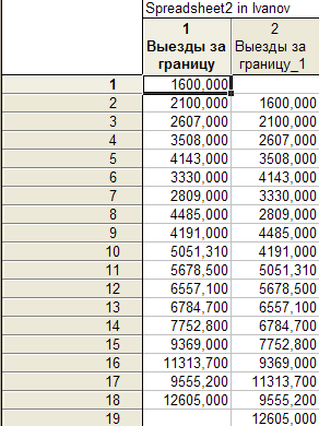 После этого нажимаем на кнопку Save variables для сохранения результатов преобразования. Результаты сохраняются в отдельной электронной таблице в виде двух переменных. В нашем примере это «Выезды за границу» – исходный динамический ряд и «Выезды за границу_1» – ряд, отстающий от исходного на один лаг (рис. 2.25.) Во избежание потери данных предлагается поместить данную таблицу в исходную рабочую книгу путем нажатия на кнопку Add to Workbook и выбором соответствующей рабочей книги (Ivanov) (рис. 2.26.). Отметим, что новый рабочий лист автоматически становится активным (рис. 2.27.)