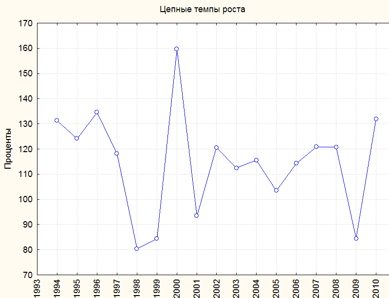 Приведем графические изображения цепных и базисных темпов роста (рис. 2.38, 2.39).