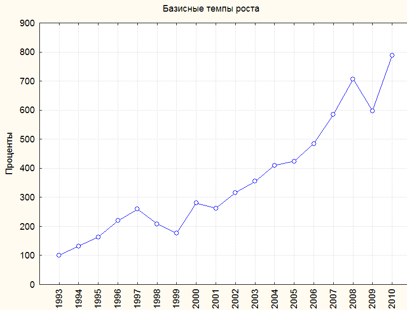 Рис. 2.39. Динамика базисных темпов роста переменной «Выезды за границу»