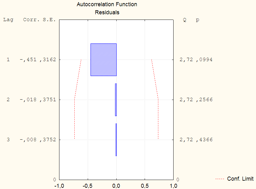 В тематической области Autocorrelations & Crosscorrelations в левой стороне диалогового окна расположены три кнопки: Autocorrelations, Partial autocorrelations, Crosscorrelations, при нажатии на которые STATISTICA выводит на экран табличные и графические результаты расчета соответственно автокорреляций, частных автокорреляций и кросс-корреляций с количеством лагов от 1 до числа, указанных в поле Number of lags. Установим число лагов равное 3. Значение в поле p-level for highlighting, определяющее уровень значимости оставим без изменений ( В дереве рабочей книги появятся график и таблица с одинаковым названием Autocorrelation Functions. Таблица (рис. 3.32) содержит расчетные значения коэффициентов автокорреляции (столбец Autocorrelations), стандартных ошибок (Standard Errors), так называемых Box & Ljung статистик и расчетного уровня значимости P. При этом система также дает подсказки пользователю: если строка выделена красным цветом, то коэффициент корреляции на данном лаге является статистически значимым. График (рис. 3.33) содержит графическое изображение статистик, рассмотренных в таблице. При этом горизонтальные столбцы означают коэффициенты корреляции. Графическое представление рассчитанных коэффициентов автокорреляции наглядно демонстрирует, что они статистически незначимы, поскольку значения ни одного из них не выходят на границы доверительных интервалов, обозначенных на графике красной пунктирной линией.