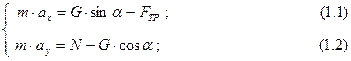 1. Розглянемо рух матеріальної точки на ділянці Запишемо динамічні рівняння руху точки в проекціях на обрані осі координат. Проекції сил, що співпадають з осями за напрямком, вважаємо додатними, а протилежні – від’ємними.