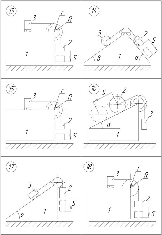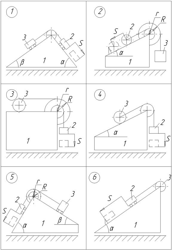 Визначити переміщення призми 1 по горизонтальній гладенькій поверхні, якщо центр мас тіла 2 опустився на відстань S відносно призми 1 (вар. 1.1-1.19) або тіло 2 повернулося на заданий кут навколо горизонтальної осі (вар. 1.20-1.30). В початковий момент часу матеріальна система знаходиться у спокої. Дані для розрахунків приведені в табл. 1.1. (