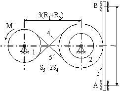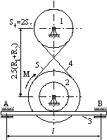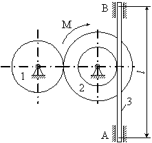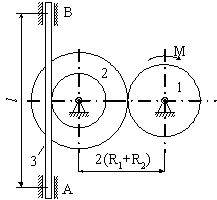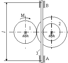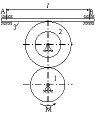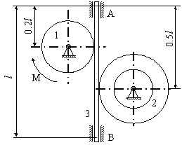 Матеріальна система (рис 4.1-4.5) приводиться до руху моментом М. Знайти прискорення тіла 3, натяг пасів, зусилля між тілами, реакції в’язей в момент часу t=t1. Масами пасів та їх ковзанням по шківах знехтувати. Натяг у ведучій частині нескінченного паса (варіанти 2, 5, 6, 11, 14, 17, 23, 24, 28) вдвічі більший від натягу у веденій частині. Однорідний диск 1 та ступінчатий шків 2 обертаються навколо горизонтальних осей. В точках контакту тіл ковзання відсутнє. Коефіцієнт тертя ковзання f. Дані для розрахунків взяти з таблиці 4.1 де прийняті такі позначення: m1, m2, m3 – маси тіл 2 та 3; і2 – радіус інерції тіла 2 відносно горизонтальної осі, що проходить через центр мас тіла; R1, R2, r 2 – розміри тіл 1 та 2; l – відстань між опорами тіла 3. Таблиця 4.1