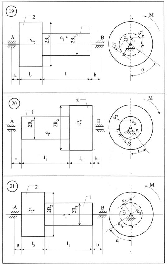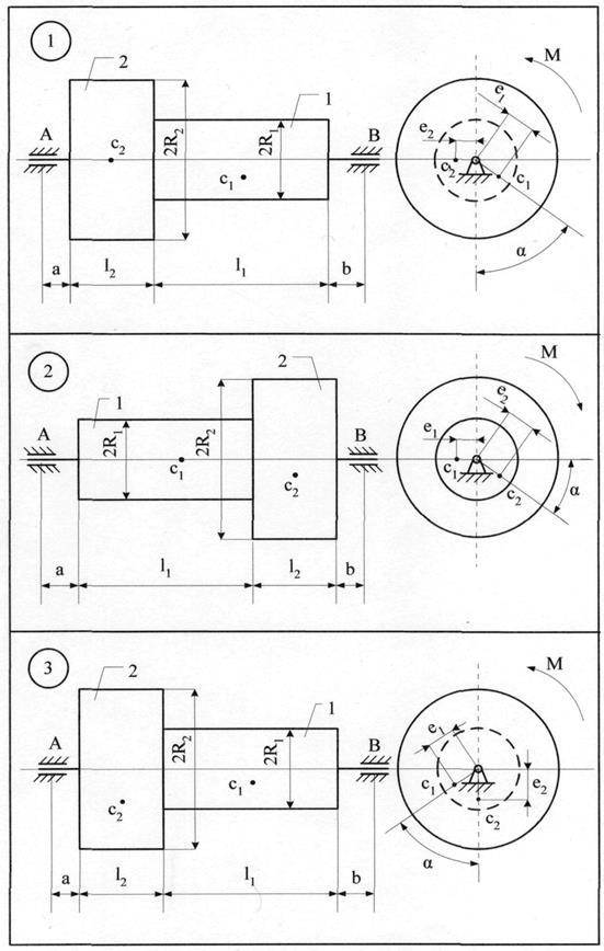 m1=3 кг; m2=5 кг; е1=0,1 мм;е2= 0,3 мм; l1= 0,25 м; l2 = 0,25 м; а = 0,05 м; b = 0,15 м; R1=0,1 м; R2=0,2 м.