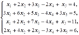 Так как из первого и второго уравнений x 5 уже исключена, то в качестве базисных можно взять неизвестные x 1, x 3, x 5, а x 2, x 3 - свободные. Полагая x 2= a и x 4= b, получаем x 1=- Ответ: {(- Замечание. Как и в случае метода Гаусса, элементарные преобразования системы равносильны преобразованиям расширенной матрицы системы: