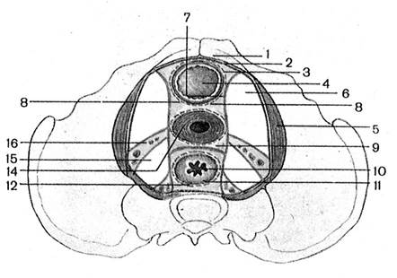 У женщин брюшина при переходе с задней поверхности мочевого пузыря на переднюю поверхность матки образует неглубокое пузырно-маточное углубление. Спереди шейка матки и влагалище находятся подбрюшинно. Охватив дно, тело и шейку матки сзади, брюшина спускается к заднему своду влагалища и переходит на прямую кишку, образуя глубокое прямокишечно-маточное углубление (рис. 7). Дупликатуры брюшины, направленные в стороны от матки к боковым стенкам таза, называют широкой связкой матки. Между листками широкой связки матки находятся маточная труба, собственная связка яичника, круглая связка матки и идущие к яичнику яичниковые артерия и вена, лежащие в связке, поддерживающей яичник. В основании связки лежат мочеточник, маточная артерия, венозное сплетение и маточно-влагалищное нервное сплетение. Кроме широких связок, матку в ее положении укрепляют круглые связки, прямокишечно-маточные и крестцово-маточные связки и мышцы мочеполовой диафрагмы, к которой фиксировано влагалище. Яичники располагаются позади широкой связки матки ближе к боковым стенкам таза. При помощи связок яичники соединены с углами матки, а при помощи подвешивающих связок они фиксированы к боковым стенкам таза. Подбрюшинный отдел таза расположен между брюшиной и париетальной фасцией, вмещает части органов, не имеющие брюшинного покрова, конечные части мочеточников, семявыносящие протоки, семенные пузырьки, предстательную железу, у женщин – шейку матки и часть влагалища, сосуды, нервы, лимфатические узлы и окружающую их рыхлую жировую клетчатку. В подбрюшинном отделе малого таза в сагиттальной плоскости проходят два отрога фасции; спереди они прикрепляются у медиального края внутреннего отверстия запирательного канала, затем, следуя спереди назад, сливаются с фасциями мочевого пузыря, прямой кишки и прикрепляются к передней поверхности крестца, ближе к крестцово-подвздошному сочленению. В каждом из отрогов располагаются висцеральные ветви сосудов и нервов, идущих к органам таза. Во фронтальной плоскости, как было отмечено, между мочевым пузырем, предстательной железой и прямой кишкой у мужчин, между прямой кишкой и влагалищем у женщин располагается брюшинно-промежностный апоневроз, который, дойдя до сагиттальных отрогов, сливается с ними и достигает передней поверхности крестца. Таким образом, можно выделить следующие париетальные клетчаточные пространства; предпузырное, позадипузырное, позадипрямокишечное и два боковых (рис. 8). Позадилобковое клетчаточное пространство расположено между лобковым симфизом и висцеральной фасцией мочевого пузыря. Оно делится на предбрюшинное (кпереди) и предпузырное пространства. Предпузырное пространство – относительно замкнутое, треугольной формы, ограничено спереди лобковым симфизом, а сзади предпузырной фасцией, с боков фиксировано облитерированными пупочными артериями. Предпузырное пространство таза по ходу бедренного канала сообщается с клетчаткой передней поверхности бедра, а по ходу пузырных сосудов – с боковым клетчаточным пространством таза.