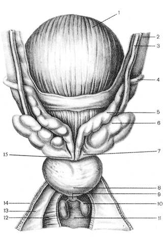 Рис. 12. Задняя поверхность мочевого пузыря и мочеполовой диафрагмы. 1 - мочевой пузырь: 2 - брюшина; 3 - мочеточник; 4 - семявыносящий проток; 5-ампула семявыносящего протока; 6 - семенной пузырек; 7, 15 - семявыделительный проток;