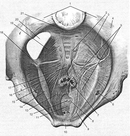 Рис. 15. Мышцы и фасции дна малого таза мужчины (вид сверху). 1 - крестцовая кость; 2 - вентральная крвстцово-копчиковая связка; 3 - грушевидная мышца; 4 - крестцово-подвздошный сустав; 5 - верхняя фасция диафрагмы таза; 6 - запирательный канал (с сосудами и нервом): 7 - прямая кишка; 8 - сфинктер мочеиспускательного канала; 9 - лобково-предстательная связка; 10 - лобковый симфиз;