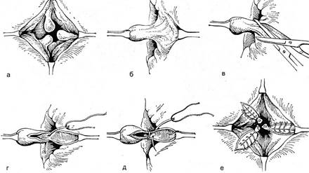 Операции при выпадении прямой кишки. Выпадение прямой кишки – состояние, при котором кишка выворачивается наружу через задний проход. По характеру выпадающего участка различают три формы выпадения [Аминев A.M., 1938]: 1) выпадение заднего прохода; 2) выпадение прямой кишки; 3) выпадение с инвагинацией прямой и сигмовидной кишки. Существует несколько методов хирургического лечения этого сложного патологического состояния, и применяются они в зависимости от формы выпадения: 1) операции, суживающие задний проход; 2) пластические операции на тазовом дне; 3) резекция прямой или сигмовидной кишки; 4) внутрибрюшинные ректопексии. Многие хирургические приемы, описанные в различных руководствах по хирургии и проктологии, в настоящее время применяют редко в силу их травматичности и неэффективности. В настоящее время при изолированном выпадении заднего прохода чаще применяют операцию Миллигана – Моргана, включающую в себя суживание заднего прохода. При выпадении прямой кишки чаще выполняют внутрибрюшную ректопексию по Кюммелю – Зеренину. Суть операции состоит в фиксации швами переднебоковой поверхности сигмовидной и прямой части толстой кишки к связкам и надкостнице крестца. При выпадении и инвагинации прямой и сигмовидной кишки производят резекции этих частей с наложением анастомозов «конец в конец». Подобные операции производят внутрибрюшинным и брюшинно-промежностным доступами. Ректопексия по Кюммелю – Зеренину. Операция фиксации прямой кишки наиболее часто применяется в проктологической практике. Показание: выворачивание прямой кишки через задний проход наружу. Положение на операционном столе: лежа на спине с валиком под крестцом. Оперативный доступ: нижняя срединная лапаротомия. Оперативный прием. После вскрытия брюшной полости петли тонкой кишки отводят кверху, сигмовидную кишку – влево. Над крестцом, на Завершение операции. Париетальный листок брюшины подшивают к прямой кишке. Рану брюшной полости зашивают наглухо. Иссечение слизистой оболочки прямой кишки по Лонгу. При умеренной степени выпадения прямой кишки применяют способ циркулярного одномоментного иссечения слизистой оболочки с геморроидальными узлами при помощи степлера (способ предложил A.Long в 1993 г.– рис. 38, а). Техника вмешательства: 1) в прямую кишку вводят дилататор заднего прохода (рис. 38, б); 2) через дилататор вводят аноскоп для наложения на слизистую оболочку кисетного шва (рис. 38, в); кисетный шов накладывают на расстоянии 5 см и более от зубчатой линии, что определяется степенью выпадения прямой кишки; 3) вводят степлер, головку его располагают над кисетным швом; при помощи умеренного натяжения кисета подвижную часть слизистой оболочки затягивают в аппарат (рис. 38, г); при нажатии ручки происходит автоматическое отсечение и одновременное прошивание скобками слизистой оболочки (рис. 38, д); в некоторых случаях накладывают дополнительные отдельные швы. Завершение операции. Производят туалет слизистой оболочки и удаление инструментов. Операции при трещинах заднего прохода. Показания: наличие грубого дефекта слизистой оболочки заднепроходного канала, крайне болезненного и не заживающего при ранее примененных консервативных методах лечения. Оперативный прием: расширение сфинктера заднего прохода ректальным зеркалом, иссечение дефекта слизистой обол