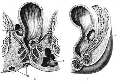 Рис. 40. Схема расположения гнойников при остром парапроктите. а – фронтальный разрез таза; б – сагиттальный разрез таза; 1 – пельвиоректальный абсцесс; 2 – седалищно-прямокишечный абсцесс; 3 – подкожный (перинеальный) абсцесс; 4 – позадипрямокишечный (ретроректальный) абсцесс.