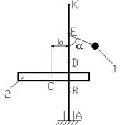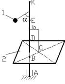 Условие задания. Вертикальный невесомый вал АК (рис. Д4.0–Д 4.9), вращающийся с постоянной угловой скоростью ω = 5 с-1, закреплен подпятником в точке А и цилиндрическим подшипником в точке, указанной в столбце 2 табл. Д4 (АВ = ВD = DE = EK = a = 1 м). К валу жестко прикреплены невесомый стержень 1 длиной l 1 = 0,8 м с точечной массой m1 = 6 кг на конце и тело 2 массой m2 = 10 кг с центром масс С. Тело 2 имеет форму сплошного однородного тонкого диска (рис. Д4.0, Д4.1, Д4.4, Д4.5); сплошной тонкой квадратной пластины (рис. Д4.2, Д4.3); однородного тонкого кольца (рис. Д4.6, Д4.7); однородного горизонтального стержня (рис. Д4.8, Д4.9). Точка крепления стержня 1 и уровень крепления тела 2 указаны в столбцах 3 и 4 табл. Д4. Угол наклона α стержня 1 – в столбце 5, расстояние b от центра масс С тела 2 до оси вала – в столбце 6. Определить величины реакций подпятника и подшипника. Указания. При решении задачи Д4 следует принять, что центр масс С тела 2 и стержень 1 лежат в плоскости чертежа. Также следует учесть, что когда силы инерции частиц тела 2 имеют равнодействующую