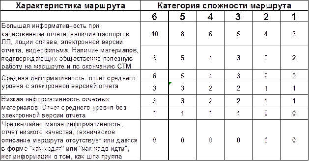 2. Чем выше категория сложности маршрута, тем большее количество и более высокую категорию трудности ЛП включает маршрут, тем больше факторов влияющих на прохождение маршрута, тем шире интервалы по градациям показателей в приведенных выше таблицах. 3. В графе «Характеристика маршрута» даны отдельные признаки характерные интервалам оценки показателей в баллах для разных категорий сложности маршрутов. Указаны верхние и нижние границы. При этом более высокие положительные или отрицательные оценки внутри интервалов соответствуют большей совокупности признаков, присущих туристскому маршруту. Судейские коллегии по дисциплинам могут вводить для показателей оценки маршрутов расширенную детализацию признаков, характерных интервалам оценок в Таблицах 1 – 5, учитывая специфику дисциплины (вида туризма), и определить их числовые значения. 4. Смысловое значение показателей оценки маршрута. 4.1. Сложность Оценивается сложность маршрута (трудность локального препятствия), пройденного в туристском спортивном маршруте. При оценке сложности маршрута используются: - Классификация туристских маршрутов; - Методика категорирования маршрутов; - Методики категорирования локальных препятствий; - Перечни классифицированных маршрутов и препятствий. Сравнительная оценка маршрутов разных категорий сложности (трудности) проводится по принципу – чем выше категория, тем выше значение показателя сложности. При определении числового значения показателя Сложность маршрута учитывается количество и трудность всех пройденных в маршруте локальных препятствий (ЛП) и протяженных препятствий (ПП), их протяженность и местонахождение на нитке маршрута. Учитываются также иные факторы, характеризующие сложность маршрута и зависящие от вида дисциплины. 4.2. Новизна Включает такие понятия как степень первопрохождения, оригинальность, нестандартность прохождения маршрута или препятствия. Оценка проводится с учетом имеющейся информации об объекте первопрохождения на момент его прохождения. Первопрохождение маршрута или элементов маршрута может быть полное или частичное (например, новый вариант прохождения ЛП). На оценку «Новизны» влияют такие характеристики, как оригинальность построения и нестандартность прохождения маршрута, связка нескольких туристских районов без использования транспортных средств для перемещения между этими районами, новизна технических средств, использованных при прохождении маршрута, использование прогрессивных технических приемов преодоления ЛП, нетрадиционные сроки проведения туристского мероприятия и др. 4.3. Безопасность Уровень обеспечения безопасности спортивного туристского мероприятия определяется набором удачных (или неудачных) стратегических, тактических и технических решений, использованных группой при прохождении маршрута. Данный критерий должен учитывать весь комплекс мероприятий, предпринятых группой как при подготовке (стратегия), так и на этапе прохождения (тактика, техника) маршрута. На значение показателя Безопасность влияет правильность и логичность выбора района, построение нитки маршрута, разработка графика движения, выбор средств передвижения, сплава, и т.п., соответствующих квалификации участников группы. При оценке маршрута по этому показателю учитывается обоснованность отклонен