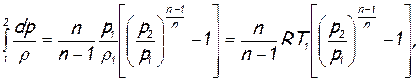 Если в процессе решения нужно получить параметры потока в каком-нибудь промежуточном сечении расчетного участка, то при интегрировании это сечение принимается за конечное. При решении можно брать неопределенный интеграл. Константа интегрирования определяется тогда из граничных условий, в качестве которых обычно берут условия на входе в расчетный участок. Для того чтобы вычислить ∫(dp/ρ), надо знать зависимость между р и ρ, т.е. иметь уравнение термодинамического процесса, при котором происходит течение газа, например уравнение политропы p/ρn=const. Если известен термодинамический процесс, то известен и показатель политропы. При политропном процессе интегрирование дает