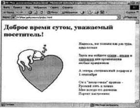 HTML (HyperText Markup Language) не является языком программирования, он является языком форматирования, т.е. придания внешнего вида web-странице, при ее присмотре в браузере. Для разметки документа используются теги. Теги заключаются в угловые скобки, и, за редким исключением, являются парными, т.е. существует открывающий и закрывающий тег. Например, чтобы отметить начало нового абзаца в документе ставится тег <р> (от paragraph). Тогда в конце абзаца обязательно должен ставиться закрывающий тег </р>. При расстановке тегов соблюдается правило: закрываются теги в порядке обратном их появлению. Например, если слово в тексте должно быть выделено жирностью (тег <b> от bold) и одновременно курсивом (тег < i > от italic), то это может быть сделано одним из следующих способов: < b > < i >слово</ i > </ b >, или < i > < b >слово</ b > </ i >. Ниже приводится текст некоторого html-документа и результат его отображения в браузере: <html> <body bgcolor=#ffffff text=#0000cc> <h1>Доброе время суток уважаемый посетитель!</h1> <p><img src="picl.gif" align="left">Надеюсь, вы попали как раз туда, куда хотели. </р> <р>3десь вы найдете <а href= "verse. html ">стихи</а>, <а href= "song, html ">песни</а> и <а href= "seen, html ">сценарии</а> для организации любых праздников. </р> <р>А теперь специальный подарок к <font color=#ff0000><b> 1 сентября</b></fоnt></р> <р>Он к "пятерочкам" привык - <br> Русский пять и пение. <br> Мне всегда его дневник <br> Портит настроение. </р> </body> </html>