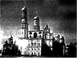 Псковскими мастерами был построен Благовещенский собор (1484— 1489), домовая церковь великих князей и церковь Ризположения (1484—1489). Итальянский архитектор Алевиз Новый соорудил Архангельский собор (1505— 1508), во внешнем виде которого ярко выразился светский стиль архитектуры. Основная конструкция — традиционная: крестово-купольный пятиглавый храм с шестью столпами, поддерживающими своды. Однако в. наружном оформлении архитектор отошел от древнерусской традиции и применил богатые архитектурные украшения (декор) итальянского Ренессанса. Архангельский собор был храмом-усыпальницей, туда были перенесены гробницы всех великих князей, начиная с Ивана Калиты, и хоронили всех великих московских князей, а затем — царей до Петра I. Стены всех храмов украшены богатой росписью. В Московском Кремле возводились также и светские постройки. В их числе Княжеский дворец, состоящий из отдельных строений, связанных между собой переходами, крыльцами, сенями. От этого дворца сохранилась Грановитая палата (1487 — 1491), построенная итальянскими архитекторами Пьетро Антонио Солари и Марком Фрязиным. Грановитая палата, получившая свое название по отделке главного фасада блоками белого граненого камня, предназначалась для торжественных дворцовых церемоний и приемов иноземных послов, служила в качестве тронного зала. Это просторное квадратное помещение (площадью 500 кв. м, высотой 9 м) с мощным столбом посредине, на который опираются четыре кресчатых свода. Архитектурным центром Московского Кремля стало выдающееся сооружение — столпообразная церковь — колокольня Иоанна Лествичника («Иван Великий», 1505—1508; надстроена в 1600). Позже были построены Теремный дворец (1635—1636), Патриарший дворец (1653—1655) и ряд небольших храмов; в 1702—1736 — здание Арсенала для хранения военных трофеев; в 1776—1787 — здание Сената, в 1839—1849 — Большой Кремлевский дворец, в 1844—1851 — Оружейная палата для хранения коллекции художественных ценностей. В XVII в. башни Московского Кремля получили существующие ныне ярусные и шатровые завершения. Среди башен наиболее значительная — Спасская, на ней часы — Кремлевские куранты (часы с боем). На территории Кремля хранятся памятники русского литейного искусств: «Царь-пушка» (XVI в.) и «Царь-колокол» (XVIII в.). В законченном живописном ансамбле Московского Кремля воплотились идеи величия и силы единого Русского государства. По типу Успенского собора были построены в XVI в. Софийский собор в Вологде, Смоленский собор Новодевичьего монастыря в Москве, Успенский — в Троице-Сергиевом монастыре и др. С конца XV в. возможности архитекторов во многом расширили применение железных связей вместо деревянных и использование подъемных механизмов. Продолжалось храмовое строительство и в других городах. По примеру Москвы монументальные соборы были воздвигнуты в Волоколамске, Дмитрове, Угличе, Ростове и в больших монастырях — Кирилле-Белозерском и др.
