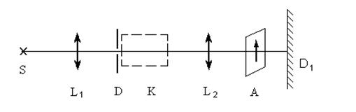 Рис. 5 Соберите установку (рис. 5), где S – источник света, L1 – конденсор, D – диафрагма, L2 – объектив и С помощью объектива L2 получите на экране D1 четкое изображение диафрагмы D, за объективом поместите поляроид (анализатор). Поворачивайте анализатор и следите за картиной на экране. Сделайте вывод и запишите его в лабораторной тетради. В этой же установке на оправу диафрагмы D поставьте другой поляроид (поляризатор). Вновь поворачивайте анализатор и следите за картиной на экране D1. Сделайте вывод. 2. Наблюдение двойного лучепреломления. Соберите установку (рис. 6),