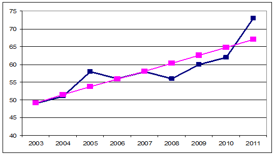 Рисунок 2.3 Выравнивание ряда динамики по среднему абсолютному приросту и среднему коэффициенту роста Таблица 2.4 и рисунок 2.3 показывают, что методом выравнивания ряда динамики по среднему абсолютному приросту с 2003 по 2011 годы выявлена тенденция увеличения потребления овощей на душу населения, причем ежегодно в среднем на 3 кг. Методом выравнивания ряда динамики по среднему коэффициенту роста за исследуемый период выявлена тенденция увеличения потребления овощей на душу населения ежегодно в среднем в 1,051 раза или на 5,1%. Таблица 2.5 Выравнивание ряда динамики аналитическим методом по уравнению прямой