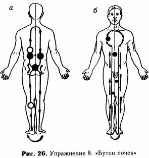 Б. Переходим на руки. От левой ладони (1) идем вверх по руке, В. Переходим на лепестки. Начиная с правого плеча проходим их изнутри последовательно по два раза (1,2,3,4,5,6,1,2,3,4,5,6), затем возвращаемся к 5-му лепестку, увеличиваем ощущение до максимального и так оставляем его, заканчивая эту часть упражнения (рис. 22 а, б). Г. Собираем и концентрируем ощущение в поясничной области (6), доводя его до разумного максимума, затем перемещаем вперед — в область мочевого пузыря (7) — и возвращаем в исходное положение (6). Таких перемещений (вперед-назад) делаем 2-3, заканчиваем в области поясницы (6). Удерживаем это ощущение в течение нескольких секунд. Упражнение 5. «Цветок души и разума» (рис. 23). Начинаем с любой стопы, в данном случае — с правой (1). Это одни проход. Делаем до 3-4 прохода с каждым из ощущений. Аналогично работаем с руками (см. рис. 23). Начинаем с запястья. охватываем руку полностью изнутри. Через плечевой сустав на уровне плечевого пояса переходим в противоположный плечевой сустав, спускаемся по другой руке до запястья и обратным ходом возвращаемся в исходную точку (3-4 прохода на каждое ощущение). Внимание! Упражнение следует делать легко, без напряжения. Если в голове вдруг возникнут шумы или появится тяжесть — следует резко уменьшить нагрузку и снизить яркость ощущений. Упражнение 6. «Дороги царства» (рис. 24). Заболевания сосудов (артерий и вен), тромбофлебиты, стимулирует работу сердца. Начинаем с нижней трети тыльной поверхности правой голени, поднимаемся (как показано на рис. 24) вверх, на голени отклоняясь в наружную сторону, на бедре — уклоняясь к анусу (4). Идем через Таким образом работаем с каждым из ощущений. Начинать Можно с любой ноги. Упражнение 7. «Бутон желудка» (рис. 25). Это первый вариант упражнения. 2-й вариант предусматривает прямой переход из левой стопы в правую — с дальнейшим повторением всего вышеописанного. С каждым ощущением работаем таким образом дважды. При достаточно выраженных заболеваниях для усиления эффекта можно выполнить после основного упражнения еще одно (рис. 25 — вид сзади). Начинаем с левой подколенной ямки, поднимаемся вверх по центру тыльной поверхности бедра (затем ягодицы) — к центральной зоне спины (к так называемому «седлу»). Здесь останавливаемся, концентрируя и усиливая яркость ощущения, затем делаем 3 интенсивных сквозных движения вперед-назад (как бы ведя «протирку»). Далее следует поверхностное движение по кругу (от «седла» вверх и обратно), потом идет аналогичный подъему спуск по правой ноге до подколенной ямки, где делается небольшая остановка с «протиркой» (3 сквозных движения вперед-назад), после чего мы вновь переходим в левую подколенную ямку и повторяем все перемещение еще раз (первый вариант) или возвращаемся к исходной точке обратным путем (второй вариант), то есть делаем 2 таких прохода. Начинать можно с любой подколенной ямки. Останавливаясь в подколенных ямках, не забываем вести «протирку». И последнее. После описанного упражнения делаем также по 2 прохода но тыльным поверхностям рук и спины, начиная и заканчивая их в нижней трети какого-нибудь из предплечий (см. рис. 25 — вид сзади). В этих точках делаем остановки и усиливаем ощущение до максимального уровня. Упражнение 8. «Бутон почек» (рис. 26). Заболевания мочеполовой сферы функционального характера, цистит, цисталгия, нефрит; заболевания орг