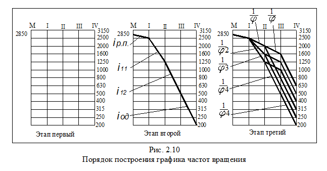 Порядок построения графика частот вращения показан на рис 2.10. Этап первый. - Проводят ряд вертикальных линий, располагая их на равном расстоянии друг от друга (обычно – не более 15 мм). Количество вертикальных линий должно быть равно числу валов в приводе, включая электродвигатель. - Проводят ряд горизонтальных линий на равном расстоянии друг от друга (т.е. через lg - На левой вертикальной линии, соответствующей валу электродвигателя отмечают точку, приблизительно соответствующую частоте его вращения – 2850 об/мин. От этой точки и начинают построение. Этап второй. - Вначале рекомендуется назначить все наименьшие передаточные отношения. Совокупность линий, изображающих наименьшие передаточные отношения, должна закончиться на пересечении линии последнего вала с линией, обозначающей наименьшую частоту вращения – 200 об/мин. Следует помнить рекомендацию (см. п. 2.7) о том, что передаточные отношения в групповых передачах желательно выбирать так, чтобы они были равны целой положительной или отрицательной степени знаменателя ряда - Для клиноременной передачи числа зубьев подбирать не надо, поэтому ее передаточное отношение можно не подчинять этому условию. Можно принять, например, передаточное отношение ременной передачи так, чтобы на первом валу получилось стандартная частота вращения, это позволит далее соблюдать требования к передаточным отношениям групповых передач. На рис 2.10 линия, изображающая ременную передачу проведена от частоты вращения 2850 об/мин до частоты вращения 2500 об/мин на валу I. Следовательно, передаточное отношение ременной передачи принято равным