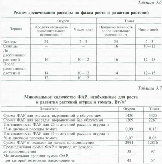 ООО "Агрисовгаз" использует типовые светотехнические пректы для до-свечивания рассады и ведения светокультуры с лампами РЕФЛАКС в новых высоких теплицах с пролетом 9,6 м. Оптимальный режим досвечивания рассады и минимальное количество ФАР, необходимое для роста и развития растений огурца и томата приведены в табл. 3.6, 3.7.
