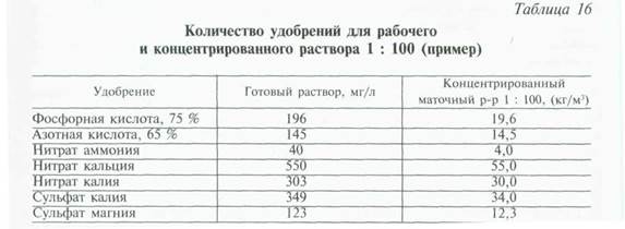 Результаты, рассчитанные в табл. 7.15, пересчитывают в мг/л для готового раствора или в кг/м3 для 100-кратного маточного. Количества удобрений, необходимых по расчету табл. 15, приведены в табл. 16. Использованы растворы кислот: 75% для фосфорной, 65% для азотной, и таким образом использованы делимые от 0,75 и 0,65. Для культур томата, огурца, сладкого перца и баклажана 100-кратные концентрированные маточные растворы с коррекцией на ионы воды приведены ранее. С их использованием нет необходимости в большинстве случаев рассчитывать питательные растворы для каждого типа воды (табл. 7.18—7.29).