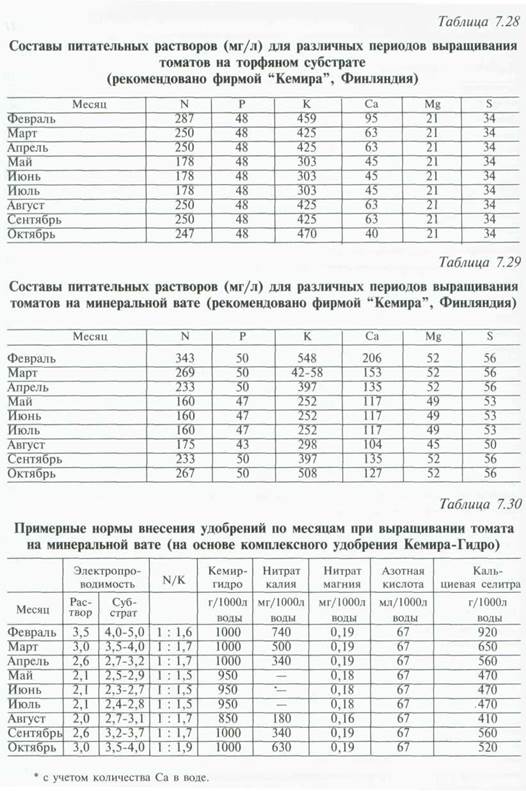 Рассмотрим составы питательных растворов для выращивания различных овощных культур на минеральной вате, разработанные на основе многолетних исследований в Научно-исследовательском центре по культурам защищенного грунта (Наалдвайк, Нидерланды).