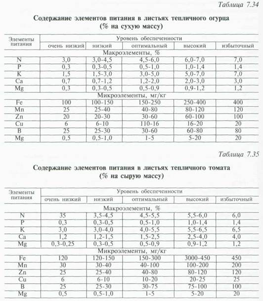 Установление критического уровня питания растений строится на основе опытов и представляет определенные трудности. Наиболее сложно установить оптимальную концентрацию неорганических форм питательных элементов в тканях растений в различные периоды роста и развития, тем более, что нормальный состав питательных элементов в растении, как указывает К. П. Магницкий (1964), колеблется в значительных пределах. Не всегда высокому урожаю соответствует повышенное содержание элементов питания. Повышенное содержание какого-либо элемента в листьях или черешках может быть обусловлено не потребностью в нем растений, а избыточным количеством его в питательном растворе, и наоборот, несколько пониженное содержание того или иного элемента может быть следствием сильного роста растения и интенсивного использования данного элемента для переработки его в органические формы. Поэтому путем исследований важно установить минимальную концентрацию питательных веществ в растениях по периодам роста, которая обеспечивала бы получение высокого урожая возделываемых культур. Обобщение результатов многочисленных анализов растений, проведенных в условиях беспочвенной культуры, позволило установить примерные концентрации питательных элементов в тканях томата и огурца по периодам роста (табл. 7.36, 7.37). При химическом анализе тканей растений определяют валовое содержание элементов минерального питания или содержание неорганических их соединений. Для определения содержания калия метод анализа не имеет значения, так как он находится в растении в виде ионов или непрочно связан с органическими веществами, в связи с чем результаты анализа валового его содержания и неорганических форм одинаковые. Неорганические формы азота и фосфора составляют небольшую часть общего количества их в растениях. При валовом Определении этих элементов количественное различие их в листьях растений, хорошо и плохо обеспеченных питанием, бывает очень незначительным, тогда как различие в содержании неорганических соединений этих элементов бывает очень большим и более точно отображает характер питания растений в исследуемый период.