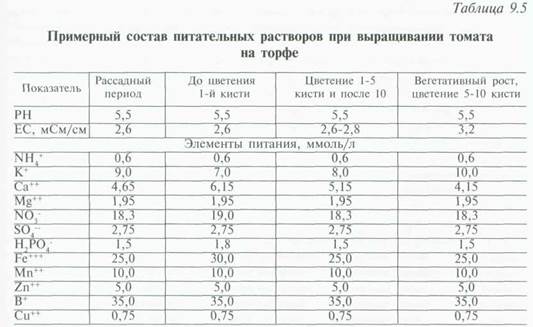 Для составления питательного раствора можно применять комплексные и простые удобрения. В этом случае необходимо обязательно использовать так называемый "узел предварительного растворения удобрений", поставляемый в комплекте с оборудованием для капельного орошения. В течение вегетационного периода питание растений осуществляется подачей питательного раствора через систему капельного полива, которая должна обеспечивать равномерное поступление его под каждое растение. Неравномерное увлажнение торфа приводит к серьезным проблемам: при подсушивании субстрата резко возрастает концентрация солей, что приводит к вершинной гнили плодов, а при переувлажнении — корни растений испытывают кислородное голодание, происходит вымывание кальция, калия, магния, присутствующих в торфе в форме подвижных гуматов. Поддерживать оптимальную влажность гораздо легче при использовании в качестве субстрата торфо-перлитных смесей (табл. 9.5). Водно-воздушный режим зависит также от того, какие капельницы используются для полива, и в какие емкости затаривается субстрат. В тепличных хозяйствах, хорошо зарекомендовали себя компенсирующие капельницы фирмы "Пластро" и полипропиленовые лотки "Мапал" (Израиль). По сравнению с полиэтиленовыми мешками, в которых часто наблюдается переувлажнение субстрата из-за плохого оттока дренажа, в лотках создается более оптимальный для корневой системы водно-воздушный режим. Известно большое количество питательных растворов для культуры томата. Для ознакомления с некоторыми из них см. главу "Питательные растворы для выращивания овощных культур способом малообъемной гидропоники".