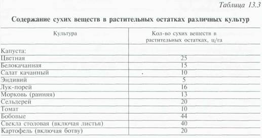 Магниевая селитра совмещается с пестицидами. Обязательна проверка на ожигаемость растений. При низком уровне содержания магния норма разового внесения магния в почву достигает 60—70 кг/га. Кальций. Хорошая обеспеченность почвы кальцием очень важна для овощ- ных культур. Его недостаток вызывает нарушение уровня питания, что приводит к физиологическим заболеваниям: вершинная гниль томата, плодовая гниль огурца и перца, краевой ожог листьев салата, некроз листьев кочанной и листовой капусты. Это происходит даже после известкования, если наблюдаются недостаточное поступление кальция в растение, избыточный темп роста в связи с повышенными дозами азота, избытком калия — антагониста кальция. Органические удобрения. Для сохранения естественной продуктивности почвы необходимо, чтобы в нее поступало достаточное количество органического вещества. Значительное его количество поступает в почву с растительными остатками. В 1 т растительных остатков в среднем содержится: N — 3,5 кг, Р2О5 — 1 кг, К2О — 4,5 кг, Mg — 0,3 кг, азот бобовых — 4—5 кг в свежей массе. Дополнительно к растительным остаткам также применяют навоз, навозную жижу, солому, компосты, торф и зеленое удобрение (сиде-раты). Содержание органического вещества рассчитывают исходя из массы свежих удобрений. Ниже приведено количество органического вещества в различных органических удобрениях (%): Навоз 20 Навозная жижа: птиц 10—15 свиней и крупного рогатого скота 5 Солома 80 Компосты 15—40 Сидераты и растительные остатки 10 Их количество учитывается при расчете норм внесения удобрений под планируемый урожай.