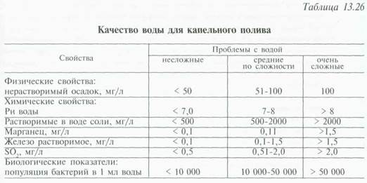 На величину показателя Рн воды Киевского водохранилища влияют гумусовые выносы реки Припять. Летом в придонных отложениях водохранилищ накапливается 5—10 мг/л СО2, иногда до 20—45 мг/л, поэтому показатель Рн снижается до 7,4. Разница показателя Рн поверхностных и придонных вод может достигать 1—1,5 Рн. Осенью, в связи с затуханием фотосинтеза, величина Рн снижается за счет подкисления СО2. Летом СО2 поглощается в процессе фотосинтеза, поэтому Рн достигает 9,4. Количество NH4 варьирует от 0,2 до 3,7 мг/л, NO3 максимален зимой — 0,5 мг/л, Р — от 0 до 1 мг/л, так как он адсорбируется Fe, общий азот — 0,5—1,5 мг/л, железо растворимое от 1,2 мг/л зимой до 0,4 мг/л летом (максимум), а обычно 0,01—0,2 мг/л. Сезонные изменения величины Рн обусловлены, главным образом, карбонатным равновесием в воде. Минимальный показатель Рн зимой — 6,7—7,0; максимальный летом — до 9,7. Северный Донец и реки Приазовья, включая водохранилища Северного Донца (Исааковское, Луганское, Краснооскольское), характеризуются повышенным содержанием кальция и натрия, хлора — 36—124 мг/л, общей минерализацией — 550—2 000 мг/л. В этих водах содержится NO3 — 44—77 мг/л (следствие их загрязнения). Подземные воды среднеминерализованы — 600—700 мг/л, Рн — 6,6—8, воды гидрокарбонатно-кальциевые и магниевые. Скважины дают воду от слабоминерализованной питьевой до сильнозасо-ленных, особенно в каменноугольных районах Донбасса. Воды Бугского лимана у г. Николаева характеризуются высокой минерализацией — 500—3 000 мг/л, содержащие НСО3 — 400—500 мг/л, Са — 50— 120 мг/л, Mg — 30—100 мг/л, сумма ионов — 500—800 мг/л, Na + К — 40— 70 мг/л, С1 — 30—70 мг/л. В Крыму находятся кроме Северо-Крымского канала, орошающего Степной Крым водами Каховского водохранилища, ряд водохранилищ: Черноре-ченское, Качинское, Симферопольское, а также воды горного Крыма. Воды горного Крыма имеют минерализацию от 200—300 до 500—800 мг/л, НСО3 от 150—200 до 300 мг/л, SO4 — от 20—30 до 300 и более мг/л, С1— от 6— 10 до 25-150 мг/л, Са - от 40-60 до 100-150 мг/л, Mg - от 6-10 до 25-40 мг/л, Na + К — от 40 до 100—200 мг/л. Воды водохранилищ имеют минерализацию от 200 до 300-400 мг/л, НСО3 - от 90-116 до 220-270 мг/л, S04 - от 9—14 до 64—75 мг/л, С1 — от 5—8 до 18—20 мг/л, Са — 36—87 мг/л, Mg — от 1-2 до 19-23 мг/л, Na + К - от 1-4 до 8-24 мг/л. Приведенные цифры следует учитывать при организации капельного орошения, желательно раз в 2—3 месяца проводить анализ воды по вышеуказанным параметрам. Анализ должен включать оценку уровней физического, химического и биологического загрязнения воды. Обычно лаборатории качества воды санэпидемстанций проводят такой стандартный анализ. При использовании воды водоемов, особенно водохранилищ днепровской воды, обычно мелководных, хорошо прогреваемых летом, с большей степенью распространения в них сине-зеленых и других водорослей и бактерий, которые образовывают студенистую слизь и забивают форсунки, необходимо регулярно проводить их очистку (см. процесс хлорирования активным хлором). В случае необходимости регулирования количества водорослей и бактерий в воде, а также продуктов их жизнедеятельности — слизи, следует непрерывно вводить в поливную воду активный хлор, чтобы на выходе из поливной системы орошения его концентрация в поливной воде была не менее 0,5—1 мг/л, в рабочем растворе — до 10 мг/л С1. Можно применять другой метод — периодически вводить очищающие дозы активного хлора 20 мг/л в последние 30—60 мин цикла орошени