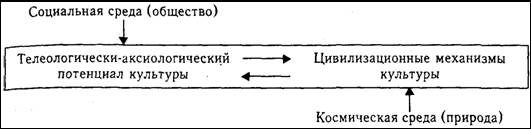 Схема показывает, что: а) рассмотренная в структурно-синхронической плоскости, культура образуется взаимосвязью двух ее составляющих, необходимых в том или ином конкретном виде во всякой саморегулирующейся и саморазвивающейся системе; б) среда, в которой существует рассматриваемая система, тоже имеет две сферы — космическую и социальную, непосредственно представленные в их взаимодействии с природой и обществом; их симметричное расположение слева и справа от центра подчеркивает непосредственную связь одного потенциала культуры с обществом, а другого — с природой; в) взаимоотношения данных потенциалов культуры подвижны — их общая плоскость может быть большей и меньшей, что открывает путь к диахроническому анализу культуры. Приведенная схема, как всякое графическое отражение пространственно-временных отношений материально-духовного бытия, не позволяет передать архитектонику и хроноструктуру системы одновременно. Поэтому ее следует дополнить таблицей, наглядно демонстрирующей направленность исторических изменений «весового» и «энергетического» соотношения обоих полюсов культуры (табл. 2.1). Таблица 2.1. Историческая динамика соотношения культуры и цивилизации