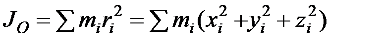 При поступательном движении твёрдого тела, как и при движении материальной точки, мерой его инертности является масса тела. При вращательном движении твёрдого тела мерой инертности является момент инерции твёрдого тела относительно оси вращения. Поэтому до исследования различных видов движения твёрдого тела следует рассмотреть вычисление моментов инерции твёрдых тел и установить основные теоремы о моментах инерции, имеющие важное значение в динамике твёрдого тела. Для установления понятий моментов инерции твёрдого тела относительно плоскости, оси и полюса проведём через произвольную точку Моментом инерции твёрдого тела относительно плоскости называется скалярная величина, равная сумме произведений массы каждой точки тела на квадрат расстояния от этой точки до плоскости. Для определения моментов инерции тела относительно координатных плоскостей опустим из каждой точки тела