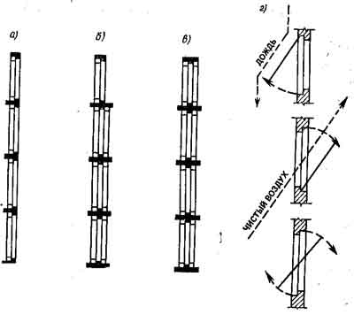 Схемы оконных переплетов а - одинарный; б - частично двойной; в - двойной; г - способы навески переплетов