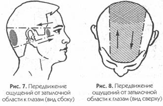 Мы не менее сотни раз кряду переводим взор с близкого на далекое и проделываем это ежедневно до полного восстановления зрения — только так и никак иначе, мы — люди упорные, мы получим свое. Не беда, если первые успехи будут менее чем скромны, главное — запоминайте каждый шажок, каждый микроскопический сдвиг к улучшению, фиксируйте в памяти свое состояние на этот момент. 2. Упражнения с ощущениями Т, П, X (тепла, покалывания, холода) Тут действуем по порядку. Закрываем глаза, вызываем в затылочной части головы ощущение Т (тепла) (как можно более четкое) и удерживаем его там в течение 20 секунд. Проделываем так 2-3 раза (пока ощущение не станет достаточно ярким), затем мысленно начинаем перемещать его от затылка к глазам и обратно, затрачивая на каждое перемещение примерно по 5 секунд. Повторяем это 5-10 раз. Затем выполняем все перечисленное с открытыми глазами (рис. 7 и рис» 8). Если дело не ладится, переходить к работе с другими типами ощущений нельзя. Следует добиться пол ной свободы в возвратно-поступательных передвижениях Т. - Добившись успеха в этих перемещениях, можно переходить к следующему процессу. 3. Работа с предметом Тут подходит любая домашняя вещь. Близоруким рекомендуем выбрать настольную лампу или картину, висящую на стене. Дальнозорким рекомендуем использовать книгу. Главное — встать от предмета на расстоянии, с которого он вам виден хуже всего. Встав, начинаем рассматривать этот предмет, слегка поводя глазами из стороны в сторону. Смотрим со вершенно спокойно — не напрягаясь, не щурясь.