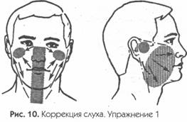 Упражнение длится 30 секунд. Повторяем его 3 раза. Затем меняем ракурс света, повернувшись в другую сторону. Осмотр также проводим трижды, после чего возвращаемся в исходное положение и опять 2-3 раза внимательно смотрим на избранный нами предмет. Следует предупредить: улучшение зрения (так же, как и слуха) происходит по нарастающей, но — не линейно. Позитивные сдвиги здесь чередуются с негативными, как приливы с отливами, но, к счастью, негативные явления краткосрочны и в конце концов затухают. Главное во время «отливов» — не терять спортивного духа и желания победить. Ваше желание справиться с досадным недугом является одним из важнейших факторов будущего успеха. Еще очень важно фиксировать в памяти свое состояние в моменты «приливов» и стараться пробудить это состояние в себе, приступая к тому или иному упражнению. Если один ваш -глаз видит нормально, во время упражнений прикрывайте его, тренируя ущербный орган. Не забывайте чередовать крайние ощущения. Если один день начат с тепла, другой должен быть начат с холода. Ощущение П (покалывания) всегда идет либо за Т (теплом), либо за X (холодом)! И последнее. Уберите в ящик стола или в дальний карман, может быть, ставшую дорогой вашему сердцу, но в общем-то мешающую вам вещицу. Мы имеем в виду очки. Привыкайте обходиться без них. Успеха вам и удачи! Улучшение слуха Практика мысленного перемещения ощущений (бесконтактного аутомассажа) дает очень хороший эффект при многих заболеваниях, сопровождающихся понижением слуха (отитах, слуховых расстройства» связанных с травмами барабанной перепонки, и т.д. Если слуховой аппарат ученика не разрушен, остро та его слуха, как правило, полностью восстанавливается. Бывает, на занятия в группах приходят люди, которым отказала в помощи не только наша, но и зарубежная официальная медицина. Освоив упражнения, они уже через несколько дней начинают слышать, (на расстоянии в 15-20 метров) голоса, атхуц телевизора, лай собак и т. д, 1. Работа с ощущениями Т. П, X (тепла, покалывания, холода) Закрываем глаза, собираем в носоглотке (в области мягкого неба) ощущение Т (тепла). Представляем его поярче и удерживаем примерно 20 секунд (повторяем 2-3 раза). Затем начинаем передвигать Т-шарик к ушам и обратно, не спеша, затрачивая примерно по 3-5 секунд на каждое челночное перемещение (пов- торяем 5-10 раз). Затем выполняем все вышеперечисленное с открытыми глазами (рис. 10). При этом стараемся хорошо прогреть носоглотку и уши (изнутри) приятным целебным теплом, с каждым повтором чуть увеличивая интенсивность Т-излучения.