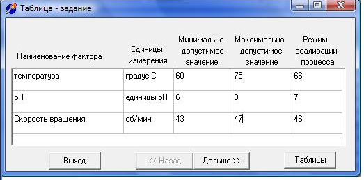 Рисунок 4. Исходные данные для решения задачи оптимизации По каждому из факторов в таблице приведены наименование, единицы измерения, область допустимых значений и значение, при котором осуществляется реализация процесса (исходный рабочий режим). Выходным контролируемым параметром исследуемого процесса является концентрация конечного продукта А (процентная концентрация). Дальнейшее исследование предполагает реализацию эксперимента для получения уравнения регрессии (модели), связывающего концентрацию продукта А со значениями факторов, указанных в таблице-задании. Эксперименты реализуются в области, центром которой является режим процесса. По полученной модели необходимо определить возможность повышения концентрации продукта А изменением режима процесса. Если это возможно, то используя метод крутого восхождения, необходимо определить параметры режима, при которых обеспечивается наибольшее значение концентрации. Определение плана эксперимента. Как указывалось выше, план эксперимента представляет собой набор значений входных факторов, при которых исследователь выполняет наблюдения выходного контролируемого параметра. Количество различных значений факторов, их координаты зависят в первую очередь от структуры модели, которую предполагает исследователь. Очевидно, что чем больше гипотетическая модель отличается от линейной, тем больше различных значений должен принимать каждый фактор при реализации эксперимента. В настоящее время, в практике исследования технологических объектов широкое распространение получили эксперименты, в плане которых каждый фактор имеет только два различных значения - два уровня. При этом эксперименты, реализующие все возможные сочетания уровней факторов, называются полными факторными экспериментами. Для случая трех факторов имеет план с число точек равным 8. План данного типа пригоден для получения независимых оценок коэффициентов регрессионной модели следующего общего вида: