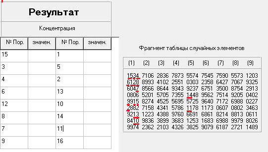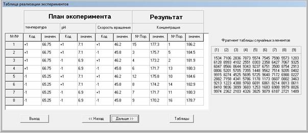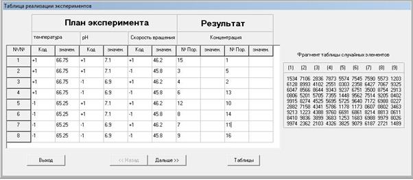 Рандомизацию следует проводить следующим образом: в таблице случайных чисел выбирается некоторый столбец (выбор тоже может быть случайным), из которого в порядке их следования выбираются числа от 1 до числа равного числу экспериментов. в нашем случае числа от 1 до 16. Если встречается уже выбранное число, от оно отбрасывается. Необходимо отметить, что и сами числа, и входящие в их состав цифры являются случайными. Поэтому из таблицы можно извлекать необходимые числа в любой последовательности. Выберем для нашего случая первый столбец. Уже первое число 1534 дает последовательность случайных чисел 1, 5, 3, 4, либо 15, 3. 4. Остановимся на последней, и вообще, договоримся, что как только встретится сочетание двух цифр, обозначающих число от 10 до 15, то сражу же мы его включаем в нашу последовательность. Итак, имеем 15, 3, 4, далее по столбцу: 6, 12, 8. 7, 9, 1, 5, 2, 13, 10. Остались числа 11, 14, и 16, поэтому переходим к следующим столба и ищем далее уже эти числа. Получаем: 14 (столбец 5, 4-я строка сверху), 11 (там же, 4-я строка снизу), 16. Таким образом, наша последовательность следующая: 15, 3, 4, 6, 12, 8. 7, 9, 1, 5, 2, 13, 10, 14, 11, 16. Эта последовательность заносится в таблицу реализации экспериментов (рис. 7).