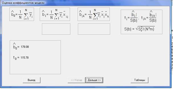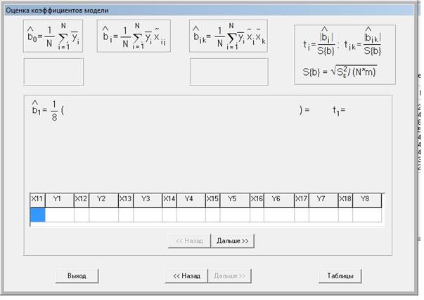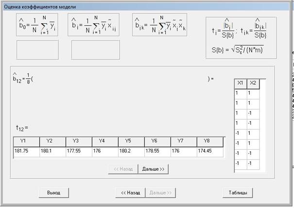 Рисунко 11. Оценка дисперсии воспроизводимости. Далее следует расчетать и оценить коэффициенты модели. Последовательность операций приведена на рис. 12.
