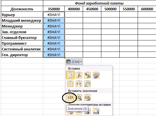 Рис.17. Выбор функции Вставить значения из меню Параметры вставки (Ctrl)