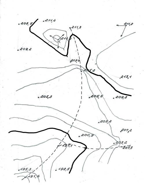 2. Изобразить рельеф горизонталями по заданным отметкам пикетов, приняв высоту сечения рельефа 2 метра. Рисунок с отметками пикетов перенести на бумагу. Горизонтали уложить и вычертить тушью.